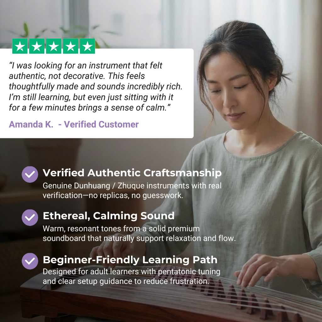 When you choose the Guzheng from Healing Sounds, you're investing in quality and authenticity. Our instruments are made from sustainable materials, ensuring durability and superior sound quality. The solid wood construction provides a natural resonance that enriches every note you play. Additionally, our Guzheng is accompanied by a set of thoughtfully curated accessories, including finger picks and a tuning wrench, to support your playing experience. Each purchase supports a commitment to preserving the art of the Guzheng while offering you an instrument that inspires creativity and joy.