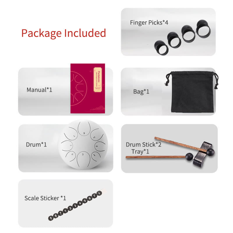 - Complete Kit Includes: Drum, 2 drum sticks, 4 finger picks, display tray, scale sticker, carrying bag, and user manual