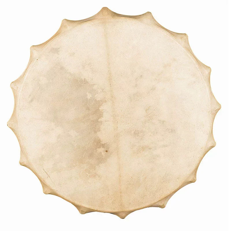 The drumhead is crafted from natural animal hide, typically goat, cow or deer skin, which provides a rich, organic tone.